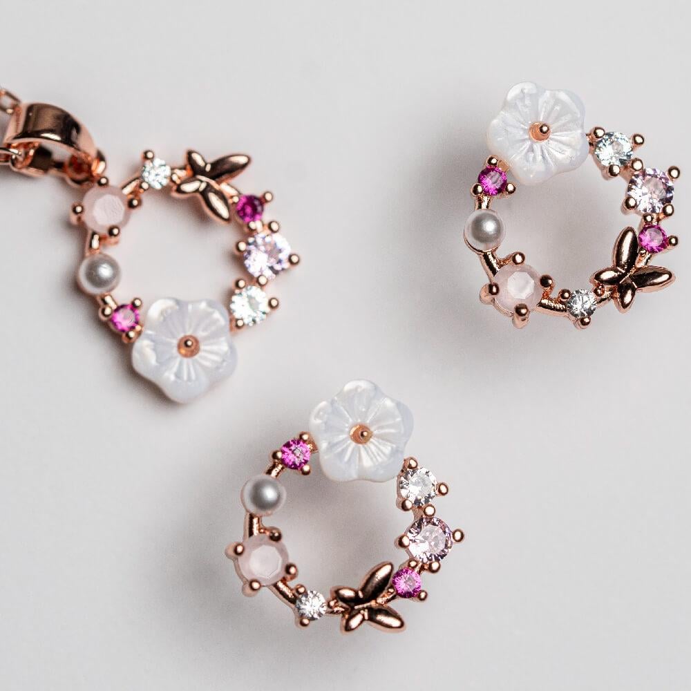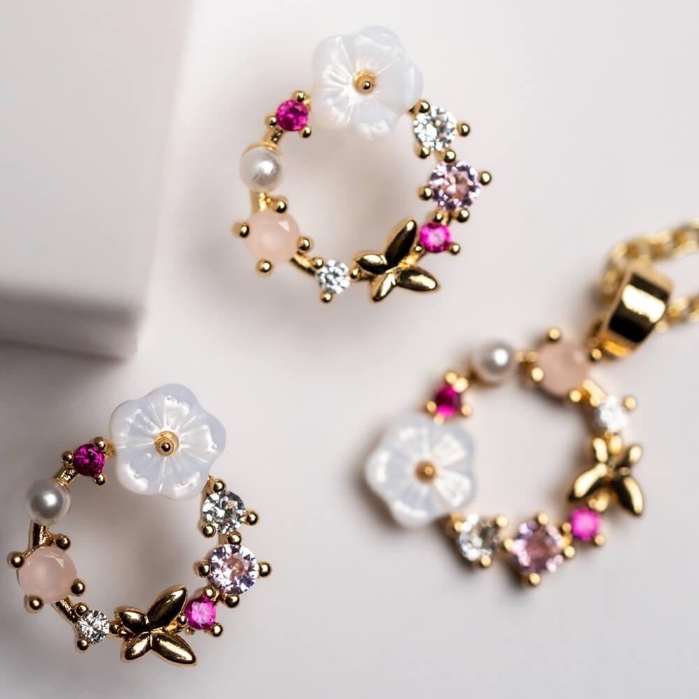 طقم أنيق يتضمن أقراط مطلية بالذهب وقلادة بتعليقة زهور ساحرة.