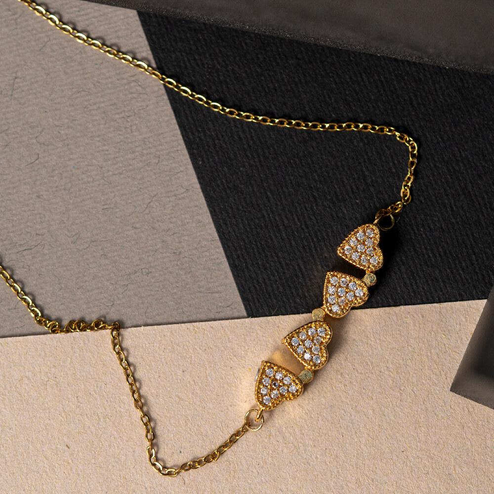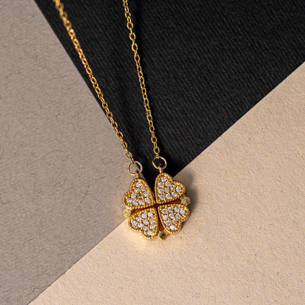 تتميز هذه القلادة الرائعة التي تحمل اسم بريق مزدوج، بسلسلة ذهبية رقيقة تدعم بأناقة قلادة قابلة للعكس مطلية بالذهب عيار 18 قيراط، مما يوفر تصميمين متميزين وجذابين في قطعة واحدة.