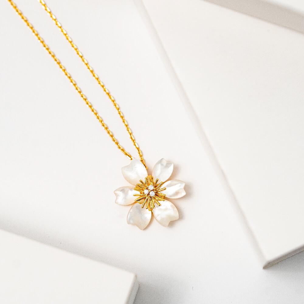 A high-quality elegant necklace plated with 18K gold with a white pearl flower pendant.